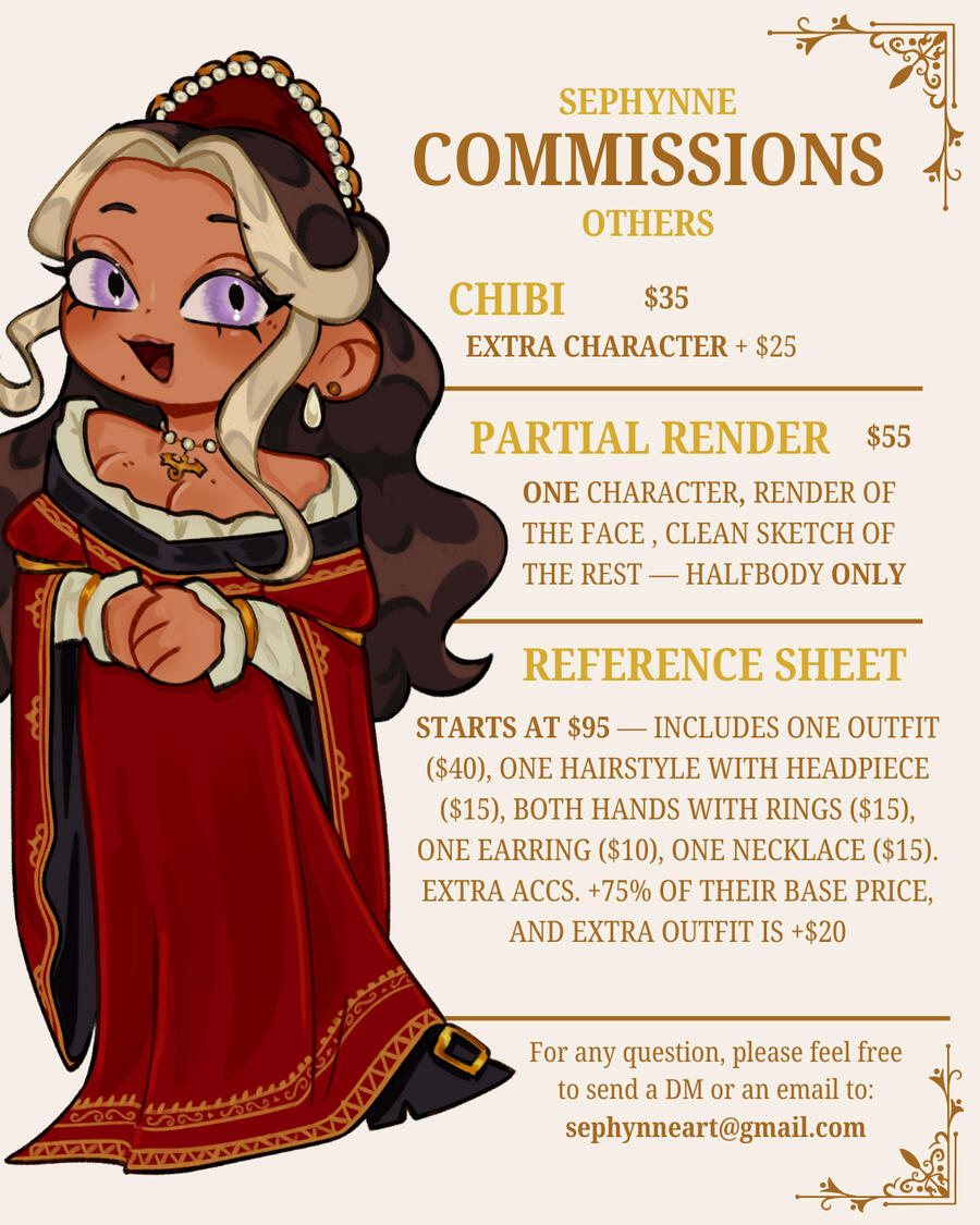 Booking:Fill the waitlist form, and I'll get back to you as soon as I can. Once I confirm your commission, I'll give you the price and ask for an email to send the invoice!After the full price of the commission is sent via PayPal, I will officially include you in my schedule, and I will begin the following process:______Each step has three revision passes before an additional fee is charged. (going backward in the process will also include extra fees to compensate for the extra labor. So make sure you are sure when approving each step going forward.)Initially, I will require:- Any descriptions and information of what you want that you think might be helpful